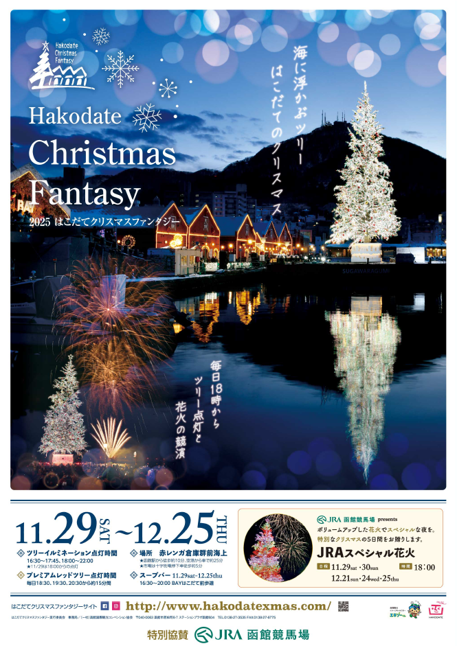 投稿日: 2025年11月7日2025年11月7日2025 はこだてクリスマスファンタジー小林電機も協賛しております 11月29日(土)から12月25日(木)まで、はこだてクリスマスファンタジーが開催されます。 今年も、巨大クリスマスツリー設置、スープバー出店、さらにはJRAスペシャル花火もあるようです。 詳しくは公式サイトをご確認ください。 公式ページ